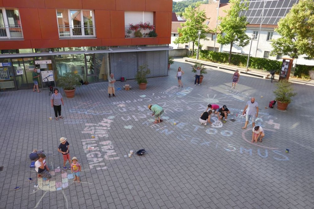 Bei herrlichem Sommerwetter waren alle Generationen vertreten. Unter Einhaltung der Abstandsregeln konnten sich die Teilnehmer*innen dieser Aktion ihre jeweiligen Plätzchen zum kreativen Schreiben und Malen auswählen und bearbeiten. Zehn Becher Straßenkreide wurden dabei verbraucht. Bei 31 Grad im Schatten floss der Schweiß in Strömen. Trotzdem herrschte eine motivierende Arbeitsatmosphäre im Austausch untereinander. Entstanden ist ein Gemeinschaftskunstwerk der besonderen Art mit konkreten gesellschaftspolitischen Aussagen.