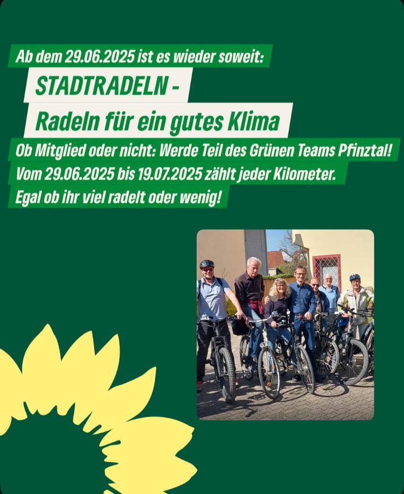 Wir wollen als Grünes Team Pfinztal an der Aktion "Stadtradeln - Radeln für ein gutes Klima" viele Kilometer erradeln und ganz vorne im Ranking mitmischen. Aber, egal wie viel Ihr radelt, Hauptsache viele von Euch nehmen teil und tragen jeden gefahrenen Kilometer ein.